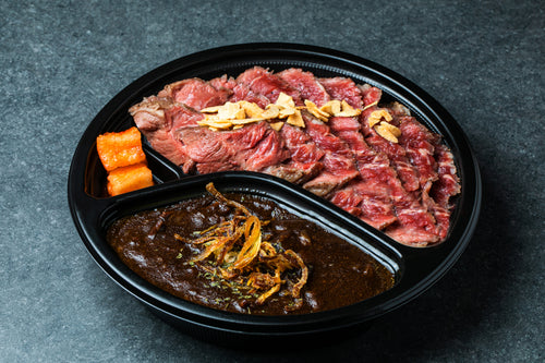 200g ¥1,780 / 100g ¥1,280黒毛和牛100%龍園カレーにこれでもか!と、牛ステーキをトッピング!満足感と幸福感がお届けします♪