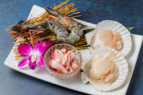 ¥7,700キムチ3種 / 前菜3種 / チョレギサラダ/ 上タン塩/A5 黒毛和牛 上カルビ /A5 黒毛和牛 上ロース / あか牛もも/サンチュ/ あか牛サーロイン焼きしゃぶ / ホタテバター焼き/ホルモン3種 / 冷麺 / デザート