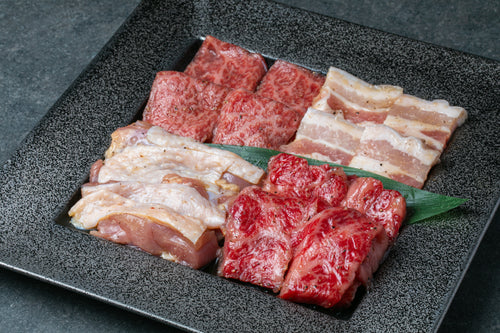 3,800黒毛和牛カルビ・もち豚 博多地鶏もも焼き・黒毛和牛ロース 計350g