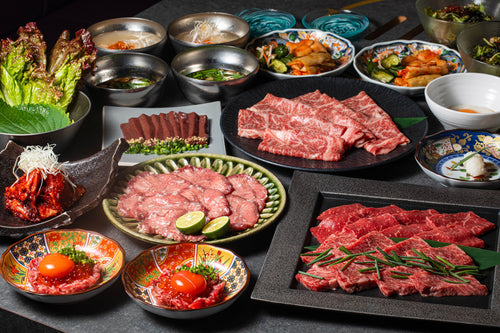 ¥11,000ローストビーフ / キムチ3種 / チョレギサラダ / 厚切りタン/サーロイン / 赤牛赤身 / 和牛ハラミたれ焼 / サンチュ/赤牛サーロイン焼きしゃぶ / ホタテバター焼き/ミックスホルモン / 桜ユッケビビンバ/ デザート